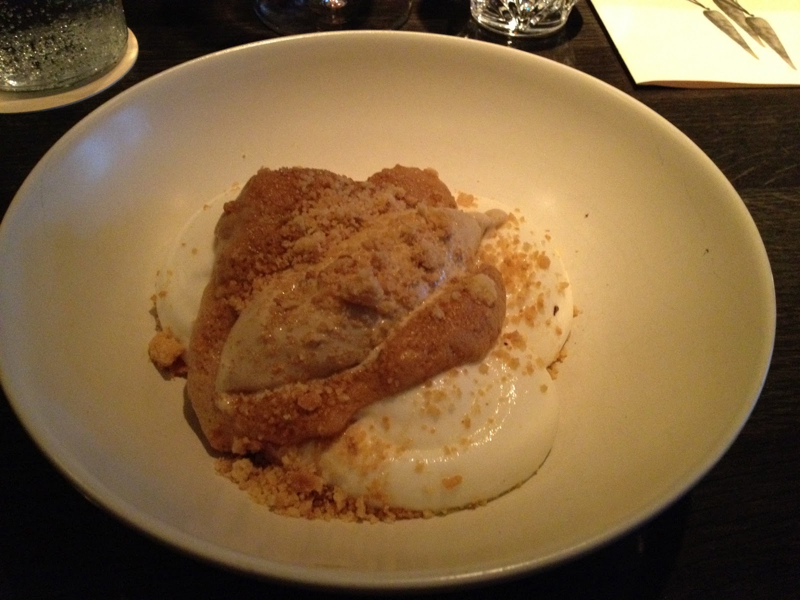 The main course was duck two ways: seared with beet puree, cherry brittle and duck confit pierogies with turnip kraut and creme fraiche. The wine here was a 2005 Lopiez de Heredia Cubillo from Spain. It's from the Rioja region of Spain, where the main grape variety is tempranillo, Spain's answer to cabernet sauvignon. The duck and the wine were a fine combination. The wine had a menthol aroma initially, but then would exhibit aromas and flavors of black cherries, mushrooms and earth. It was very vibrant for a 7-year old wine.